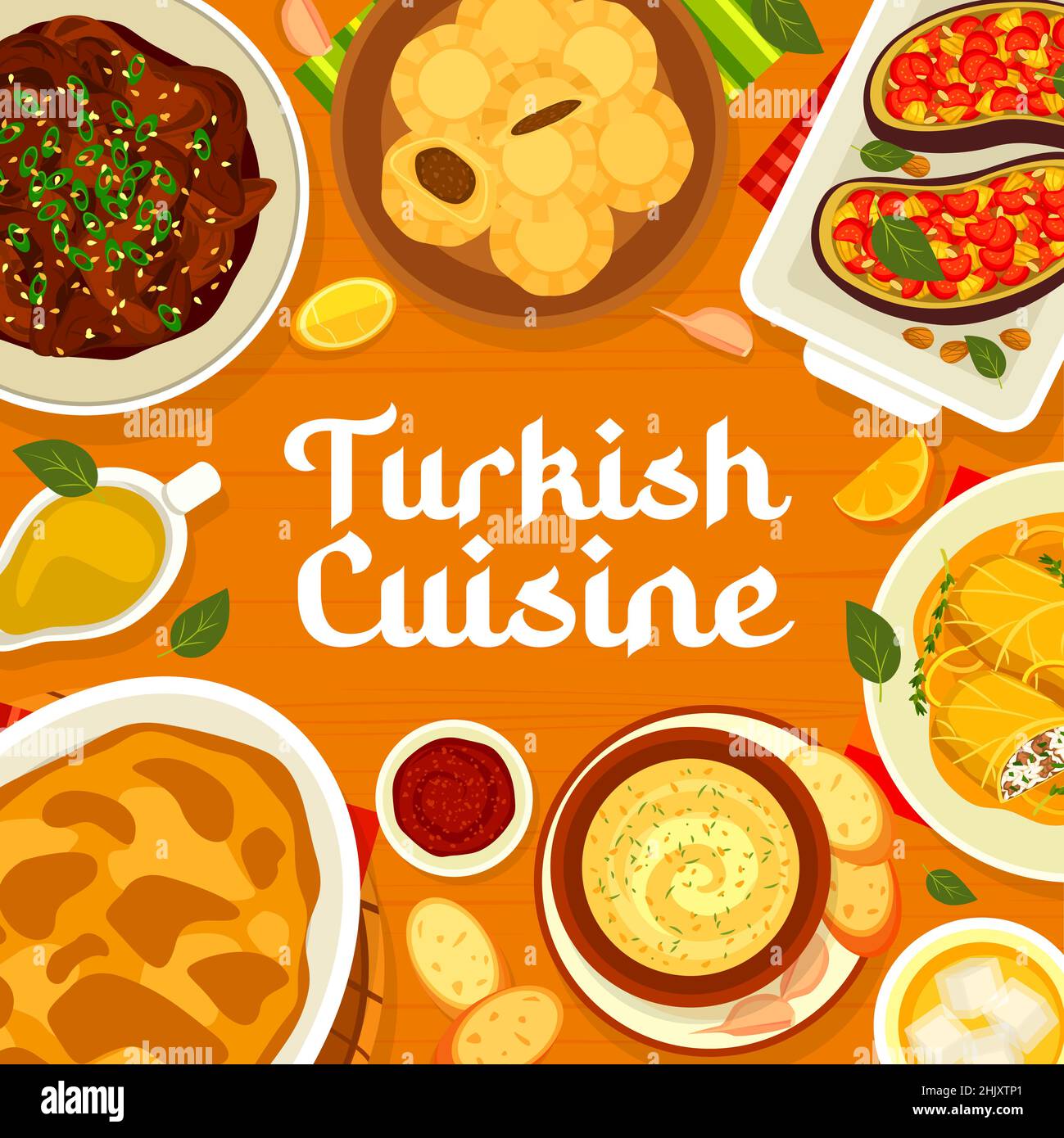 Turkish Cuisine Menu Cover With Vector Halal Food Arab Dishes Of Meat And Vegetable Meal Stuffed Eggplant Meat With Orange Sauce Moussaka And Cabb Stock Vector Image Art Alamy